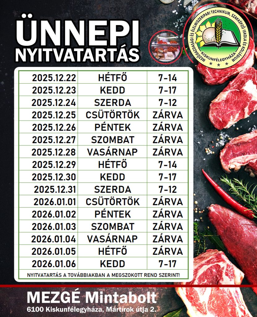 Iskolánk üzlete – a MEZGÉ Mintabolt – a város szívében (6100 Kiskunfélegyháza, Mártírok útja 2.) üzemel.
